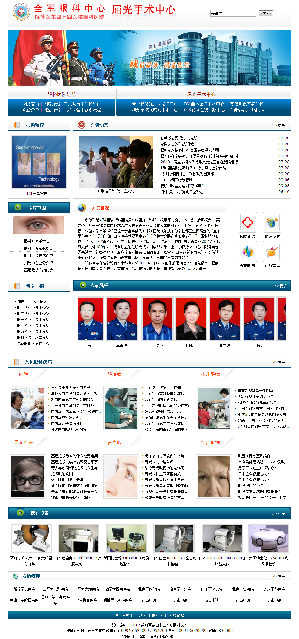 解放軍第474醫(yī)院眼科醫(yī)院集臨床醫(yī)療、科研、教學(xué)等功能于一體,是一所規(guī)模大、實(shí)力強(qiáng)、擁有一批高素質(zhì)技術(shù)人才和先進(jìn)設(shè)備的現(xiàn)代化大型眼科專科醫(yī)院。目前的水平、規(guī)模、效益、學(xué)術(shù)等指標(biāo)已經(jīng)居于全國前列。眼科醫(yī)院被解放軍總后勤部衛(wèi)生部確定為“全軍眼科中心”;是“自治區(qū)白內(nèi)障手術(shù)復(fù)明中心”、“烏魯木齊眼病防治中心”、“全國斜弱視治療協(xié)作中心”、“眼科碩士研究生學(xué)位授予培養(yǎng)點(diǎn)”、“博士后工作站”。目前擁有高職專家25人,醫(yī)務(wù)人員共計(jì)170人;擁有獨(dú)立的住院大樓、門診部、手術(shù)室、屈光手術(shù)中心。配備有世界先進(jìn)水平的各種檢查、治療和手術(shù)設(shè)備,設(shè)備總價(jià)值達(dá)8500余萬元,并擁有完備的臨床實(shí)驗(yàn)室。目前該專科整體水平在軍內(nèi)外同類學(xué)科中處于先進(jìn)地位,其影響力已經(jīng)不僅僅限于新疆地區(qū),還有許多周邊省市自治區(qū),甚至西亞五國的患者前來就診。
