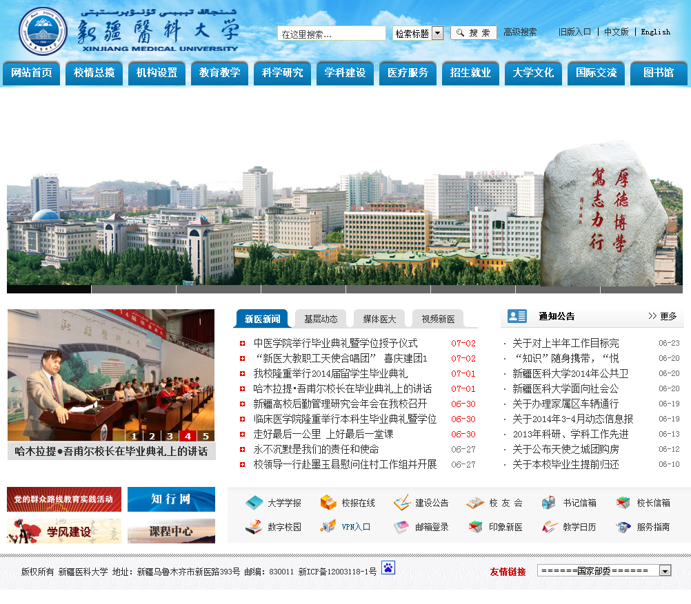 新疆醫科大學坐落于新疆維吾爾自治區首府烏魯木齊市風景秀麗的鯉魚山下,是一所具有光榮傳統的高等醫學院校,其前身新疆醫學院始建于1954年,1956年建成招生。新疆醫學院的興建,受到了毛澤東、周恩來、朱德等中央領導人的親切關懷和大力支持,毛澤東主席親自決策將新疆醫學院的建設納入“一五計劃”156個重點項目。1998年6月新疆醫學院與新疆中醫學院合并成立了新疆醫科大學,江澤民同志題寫了校名。2011年11月4日,國家衛生部與自治區簽署了共建我校的協議,為學校各項事業的發展帶來了新的動力和機遇。