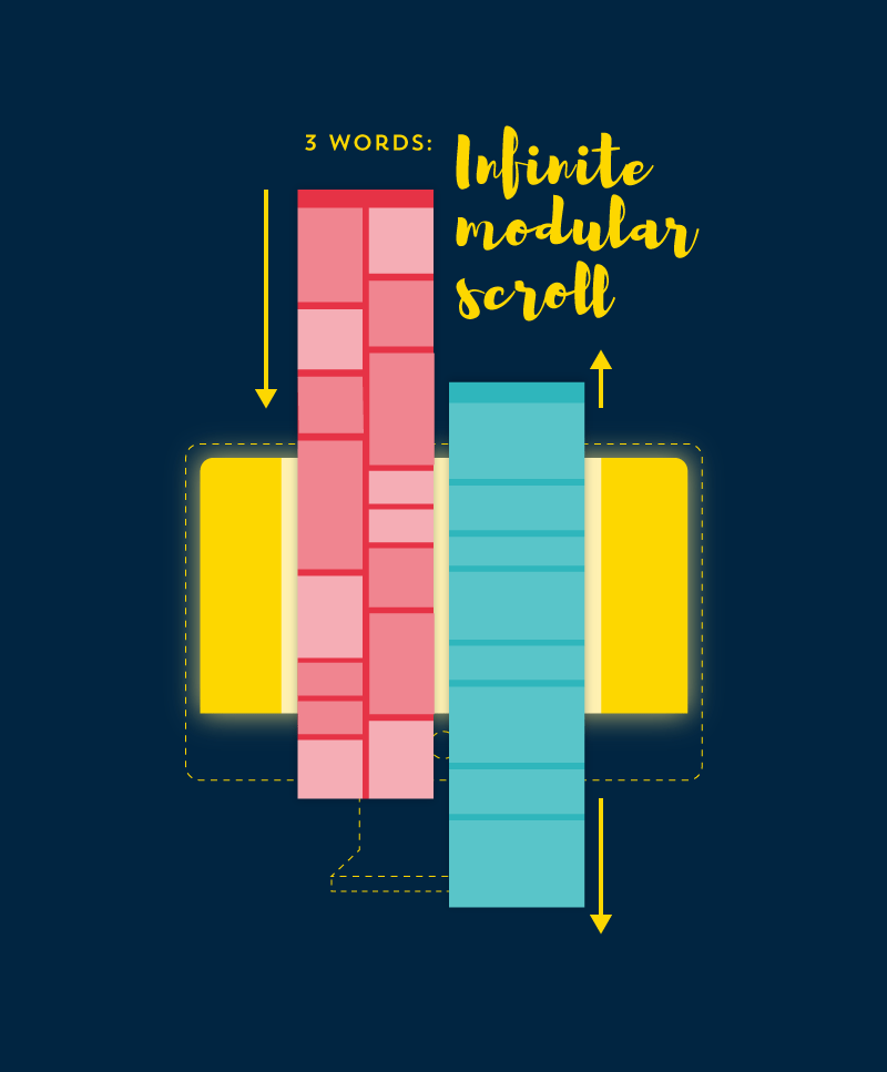 模塊化無限滾動也是基于一個相同的假設:向下滾動總是更容易的操作,用戶不用停下來點擊翻頁。這也難怪越來越多的用戶沉迷于這種交互模式。